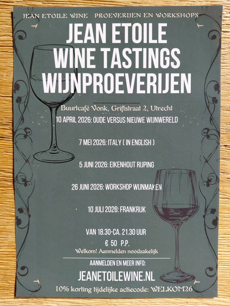Bij Jean Etoile Wine organiseren we regelmatig diverse wijnproeverijen over landen, specifieke regio's of druivensoorten en andere thema's. Elke fles wijn vertelt een verhaal en elke proeverij is een ontdekking. Leer de nuances van verschillende wijnen kennen, ontdek nieuwe smaken en deel je passie met andere liefhebbers. De wijnproeverijen wordt begeleid door een ervaren wijnkenner die je meeneemt op een boeiende reis door de wijnwereld. Of je nu een kenner bent of net begint met je wijnreis, bij ons vind je altijd een leerzame proeverij. Of leer in een workshop meer over de kunst en wetenschap van het zelf wijnmaken. Welkom in Buurtcafé Vonk in Utrecht!